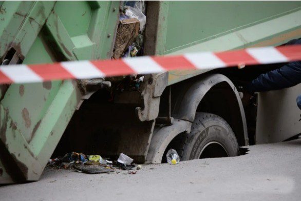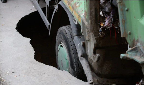 Під машиною можна побачити величезний провал щонайменше у три метри глибиною. Через новоутворений портал можливі перебої та відключення води у найближчих будинках: