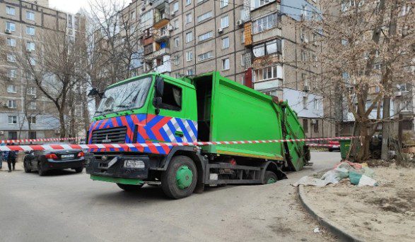 Станом на 12:36 МАЗ ще не прибрали, машина частково знаходилася під землею.