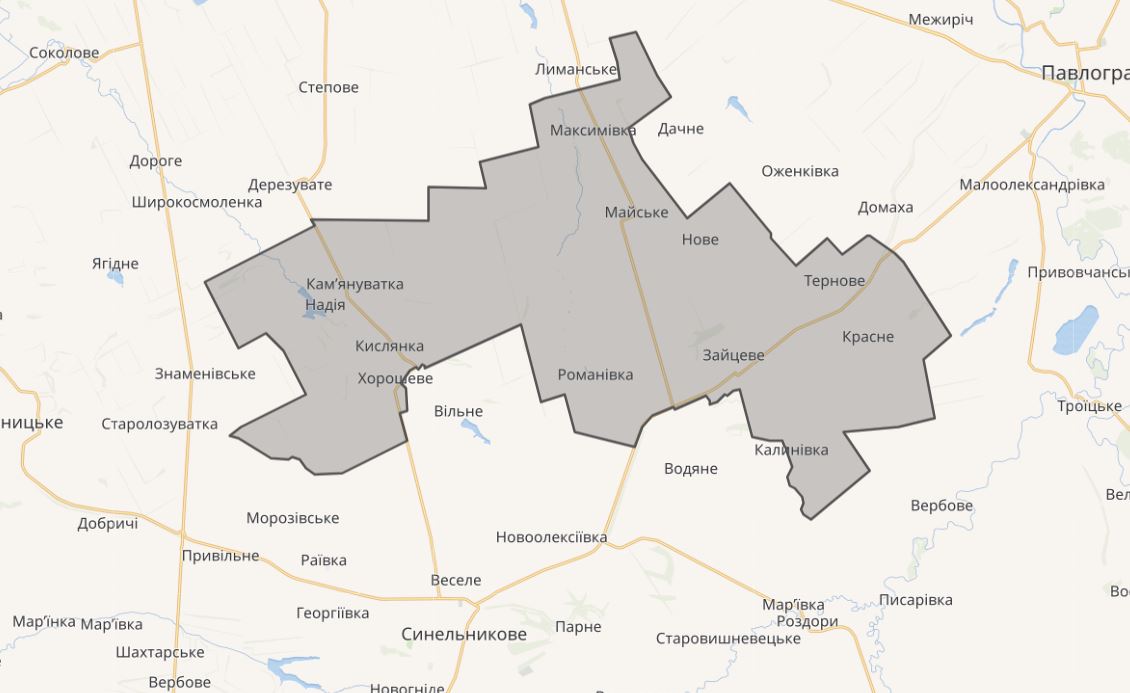 До складу громади входять 15 сіл: Зайцеве, Калинівка, Кам’януватка, Кислянка, Козачий Гай, Красне, Майське, Максимівка, Надія, Нове, Новомиколаївка, Очеретувате, Романівка, Тернове та Хорошеве.